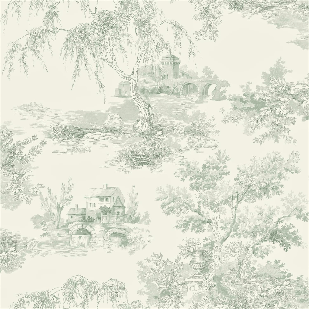 - Classic Toile Print: The A69801 Toile Green Wallpaper features a classic toile print depicting trees and scenes, printed in a traditional French style. The soft green tones create a calming atmosphere.